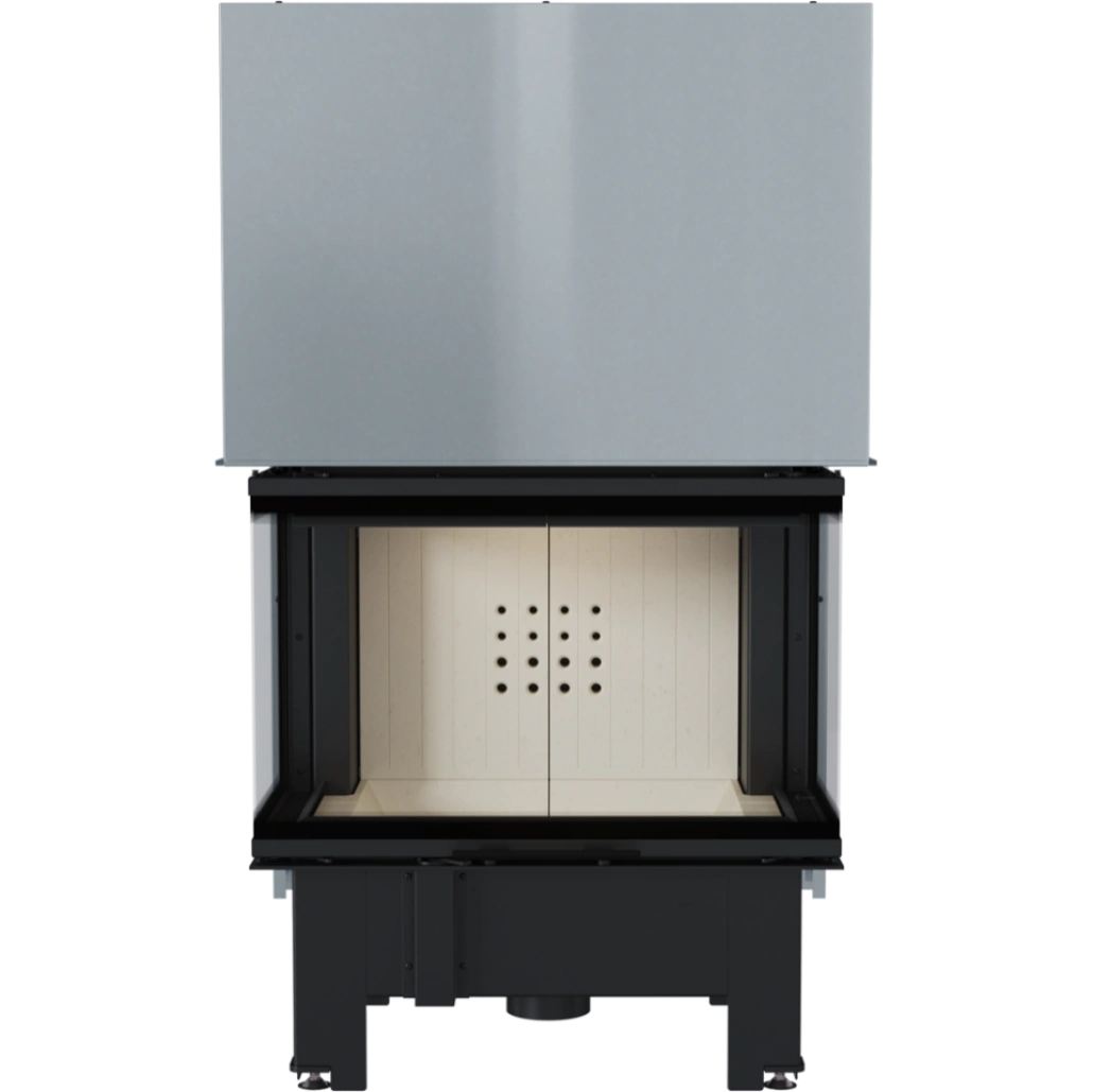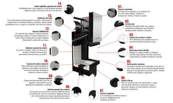 Deflector pentru extinderea traseului fumului si imbunatatirea schimbului termic , prevazut cu tevi, in conul focarului, pentru recuperarea suplimentara a caldurii din gazele de evacuare , picioare reglabile pentru ajustare, pozitionare si fixare optima , dotat cu admisie din exterior si interior , ardere pe vatra pentru reziduri de cenusa cat mai scazute