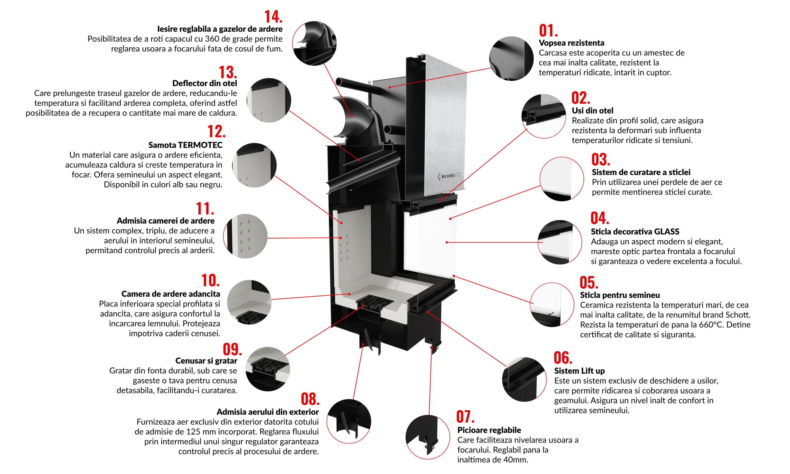 Material:Otel refractar de inalta calitate cu o compozitie ridicata de carbon pentru o rezistenta ridicata la temperaturi inalte , Captusit la interior cu samota, cu densitate mare, si rezistenta termica de pana la 1000grC. Rezistenta mecanica mare, datorita procesului de uscare urmat de cel de ardere , Sticla decorativa grafitata (contur negru) care ofera un aspect modern si elegant